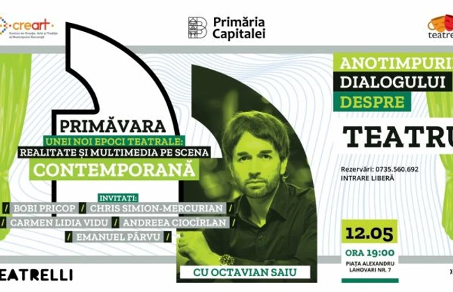 0Duminică, 12 mai, tot de la ora 19.00, va avea loc, la Teatrelli, o nouă dezbatere susţinută de Octavian Saiu: "Primăvara unei noi epoci teatrale: realitate şi multimedia pe scena contemporană". Invitaţii teatrologului sunt Bobi Pricop, Chris Simion-Mercurian, Carmen Lidia Vidu, Andreea Ciocîrlan şi Emanuel Pârvu.