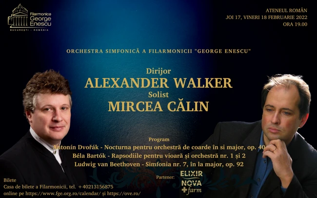 0Joi, 17 şi vineri, 18 februarie, Orchestra simfonică a Filarmonicii „George Enescu”, condusă de dirijorul britanic Alexander Walker, prezintă publicului Nocturna în si major pentru orchestră de coarde , op.40 de Antonín Dvořák, Rapsodiile pentru vioară şi orchestră nr. 1 şi 2 de Béla Bartók, cu violonistul Mircea Călin în ipostaza solistică, şi Simfonia nr. 7, în la major, op. 92 de Ludwig van Beethoven.