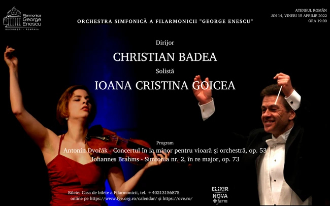 Orchestra simfonică a Filarmonicii „George Enescu” prezintă, joi şi vineri, de la ora 19.00, în Sala Mare a Ateneului Român, un concert condus de maestrul Christian Badea, prim-dirijor principal al instituţiei. Programul este alcătuit din Concertul în la minor pentru vioară şi orchestră, op. 53 de Antonin Dvořák, cu violonista Ioana Cristina Goicea în ipostază solistică, şi din Simfonia nr. 2, în re major, op. 73 de Johannes Brahms.