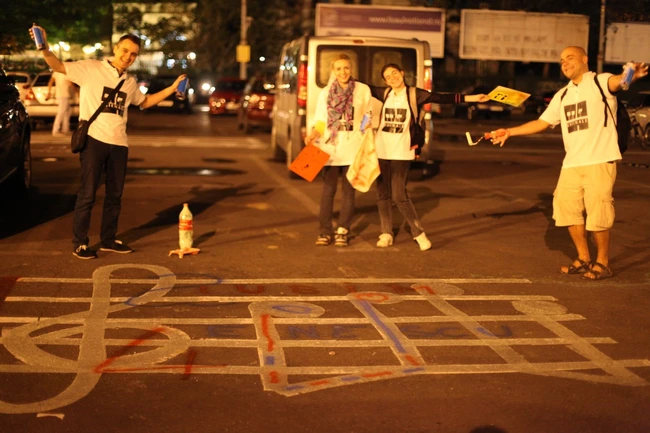 0Pentru a marca drumul cel mai bătătorit în perioada Festivalului „George Enescu“ (1-28 septembrie), acela dintre Ateneu şi Sala Palatului, echipa care organizează Bienala de Artă Contemporană a Festivalului s-a înarmat cu vopsea lavabilă, spray-uri graffiti şi cretă şi s-au apucat vineri-seară, pe la 22, să coloreze trotuarele, bordurile, parcările şi trecerile de pieton de-a lungul distanţei dintre cele două spaţii de spectacol.