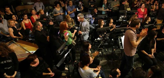 Treptat, cei care voiau s-au apropiat de fosă, care era arhiplină de protestatatari, din toate departamentele ONB. “Cei care se află pe scenă acum sunt doar o parte din corpul de balet al Operei. Restul se află aici, alături de noi”, a explicat Tiberiu Soare, în mod clar în calitate de lider al protestului şi al “rebeliunii” care-a dus la ocuparea fosei orchestrei (dirijorul are la bază şi o pregătire militară, la o şcoală de specialitate).
