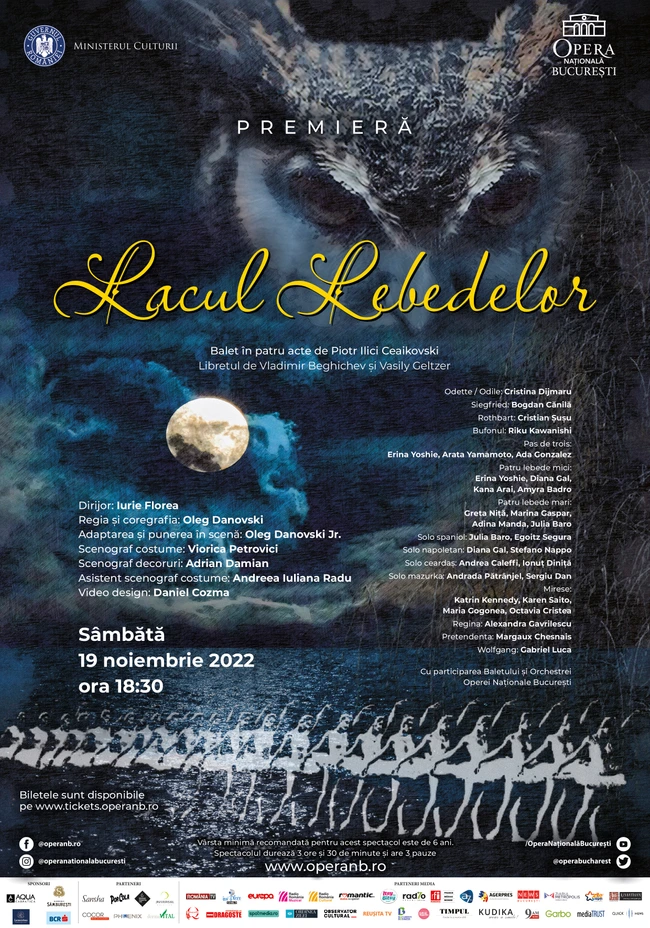 0Opera Națională București prezintă sâmbătă, 19 noiembrie, ora 18:30, premiera spectacolului de balet „Lacul lebedelor” de Piotr Ilici Ceaikovski, regia și coregrafia Oleg Danovski, adaptarea și punerea în scenă Oleg Danovski Jr., scenograf costume Viorica Petrovici, scenograf decoruri Adrian Damian. Conducerea muzicală Iurie Florea.