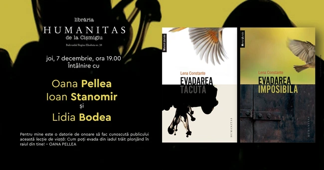 0Editura Humanitas vă invită joi, 7 decembrie, de la ora 19.00, la Librăria Humanitas de la Cișmigiu, la o întâlnire cu Oana Pellea, Ioan Stanomir și Lidia Bodea despre Lena Constante și cele două volume de memorii din închisorile comuniste: Evadarea tăcută: 3 000 de zile singură în închisorile din Româniași Evadarea imposibilă: Penitenciarul politic de femei Miercurea-Ciuc, 1957—1961, apărute în ediții îngrijite de Ioana Bot. Accesul este liber, în limita locurilor disponibile, pe baza unei rezervări prin Eventbook.