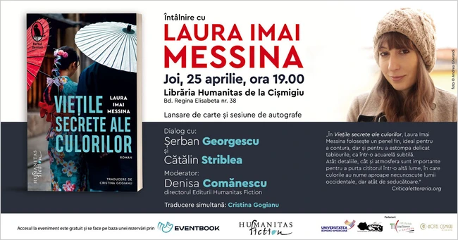 Joi, 25 aprilie, ora 19.00. Librăria Humanitas de la Cișmigiu (bd. Regina Elisabeta nr. 38)Lansarea romanului Viețile secrete ale culorilor. La eveniment vor participa, alături de Laura Imai Messina, Șerban Georgescu, directorul Departamentului de Studii Asiatice al Universității Româno-Americane, jurnalistul Cătălin Striblea și Denisa Comănescu, directorul Editurii Humanitas Fiction.Accesul este liber, în limita locurilor disponibile, pe baza unei rezervări prin Eventbook.