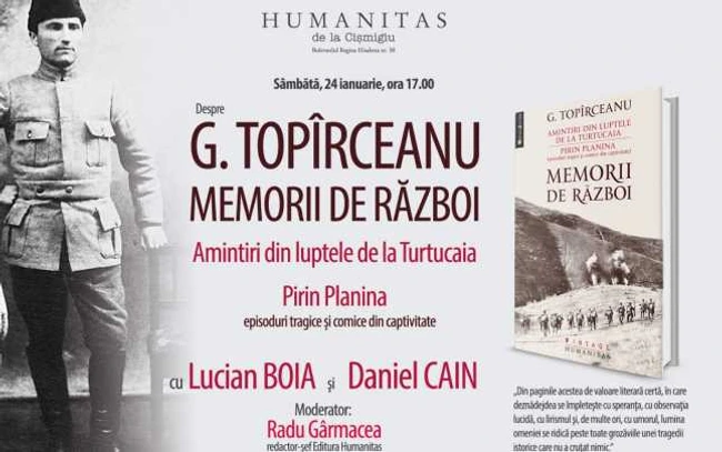 Volumul „Memorii de război. Amintiri din luptele de la Turtucaia. Pirin Planina de G. Topîrceanu”, cu subtitlul „episoduri tragice şi comice din captivitate” completează colecţia Editurii Humanitas. Cu această ocazie, Lucian Boia, Daniel Cain şi Radu Gârmacea vor purta un dialog pe tema războiului, pornind de la amintirile lui Topîrceanu.