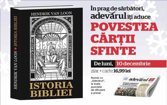 0Titlul „Istoria Bibliei” al autorului Hendrik van Loom, va fi distribuit împreună cu ziarul Adevărul începând de luni, 10 decembrie, la toate centrele de difuzare a presei. Pachetul ziar şi carte va costa 16,99 lei şi se va putea găsi la chioşcuri timp de două săptămâni, în limita stocului disponibil.