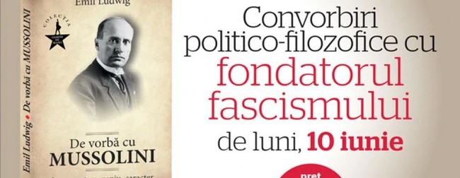 0Luni, 10 iunie, ziarul apare şi împreună cu titlul „De vorbă cu Mussolini”. Autorul, Emil Ludwig, este binecunoscut pentru popularele sale lucrari biografice ce combină faptele istorice cu psihanaliza. Pachetul ziar şi carte va costa 15 lei şi se va putea găsi la chioşcuri timp de două săptămâni, în stoc limitat.
