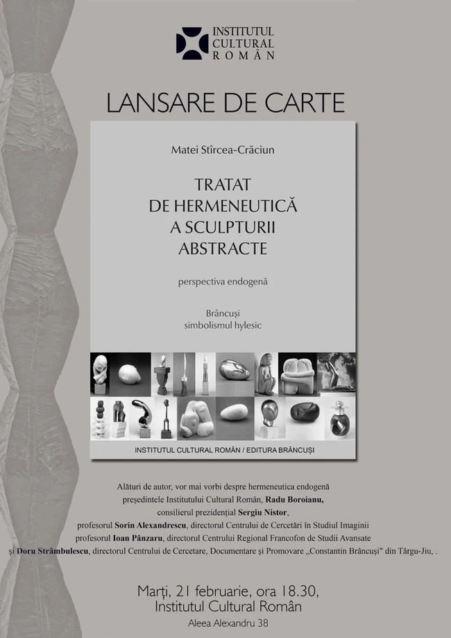 Marţi, 21 februarie 2017, de la ora 18.30, la Institutul Cultural Român (Aleea Alexandru nr 38, Bucureşti) va avea loc o masă rotunda pe marginea volumului Tratat de hermeneutică a sculpturii abstracte de Matei Stîrcea-Crăciun, publicat la Editura „Brâncuşi" din Târgu Jiu, cu sprijinul Editurii Institutului Cultural Român Alături de autor, vor mai vorbi despre hermeneutica endogenă – o nouă metodă în critica de artă – preşedintele Institutului Cultural Român, Radu Boroianu, consilierul prezidenţial Sergiu Nistor şi Doru Strâmbulescu, directorul Centrului de Cercetare, Documentare şi Promovare „Constantin Brâncuşi” din Târgu-Jiu.