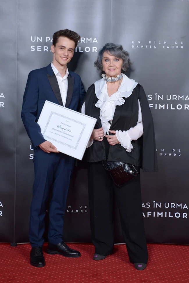 Margareta Pâslaru i-a oferit actorului Ştefan Iancu premiul pentru originalitate interpretativă, la premiera de gală a filmului „Un pas în urma serafimilor”