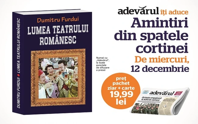 0Titlul „Lumea teatrului românesc” – amintiri din viaţa actorului Dumitru Furdui, cunoscut şi iubit de publicul spectator în special datorită seriei de filme ”Brigada Diverse”- va fi distribuit împreună cu ziarul Adevărul începând de miercuri, 12 decembrie, la toate centrele de difuzare a presei. Pachetul ziar şi carte va costa 19,99 lei şi se va putea găsi la chioşcuri timp de două săptămâni, în limita stocului disponibil.