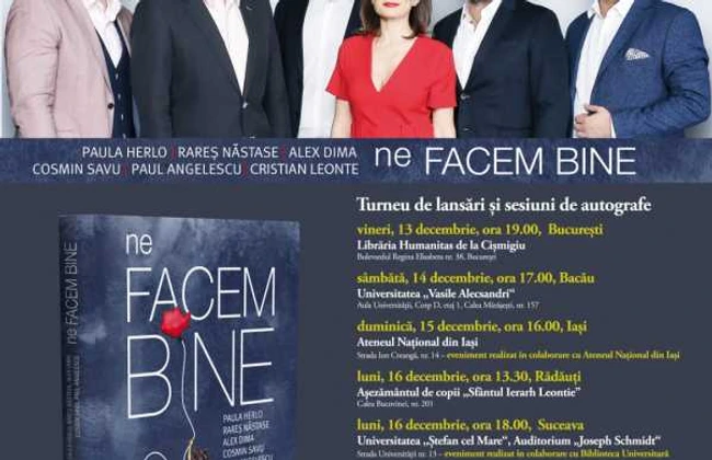 0Între 13 şi 21 decembrie are loc turneul de lansare a volumului „Ne facem bine“, o antologie cu texte de Paula Herlo, Rareş Năstase, Alex Dima, Cosmin Savu, Paul Angelescu şi un cuvânt înainte de Cristian Leonte, bestseller Humanitas la Gaudeamus 2019. După ce au lansat volumul în Bucureşti, Bacău, Iaşi, Rădăuţi, Suceava, Baia Mare şi Cluj, jurnaliştii vor fi zilele următoare la Sibiu şi Braşov şi, din nou, la Bucureşti.