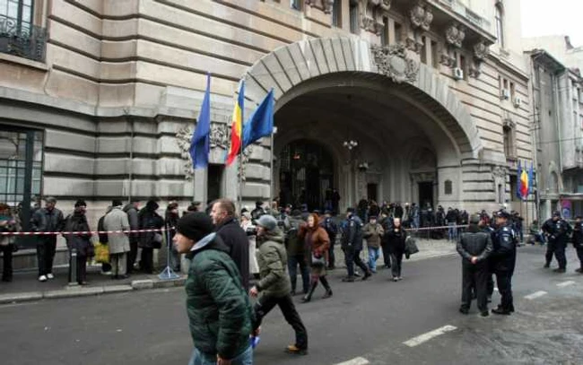 O coloană de oameni s-a format de-a lungul clădirii şi aşteaptă un semn din partea paznicilor. Se intră numai în grupuri organizate, de 10-15 persoane.