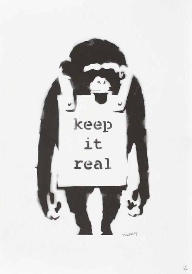 Alte renumite piese de grafică care au acelaşi preţ de pornire de 300 de euro, în licitaţia de joi, 24 iunie, semnate de Banksy, sunt: „Love is in the air”, „Keep it real”, „Bomb hugger”, „Petrol corupt” sau „Poliţistul vesel”.