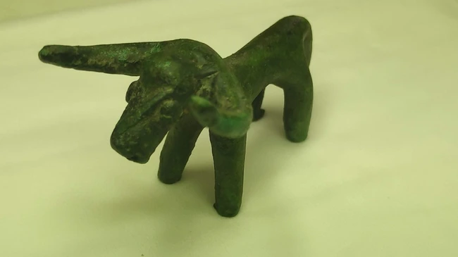 Reprezentând un taur - unul dintre simbolurile zeului grec -, obiectul este o figurină votivă, o ofrandă din bronz.