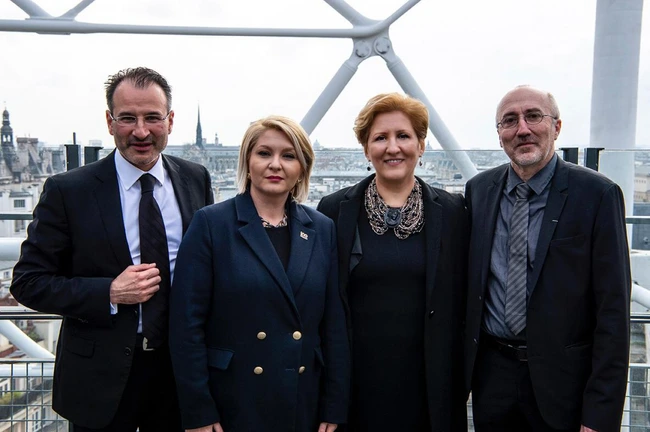 FOTO (dreapta): Liliana Ţuroiu, preşedintele ICR, alături de Gabriela Dancău. ambasadorul Extraordinar şi Plenipotenţiar. al României în Regatul Spaniei şi Pierre Buhler, preşedintele Institutului Francez Paris