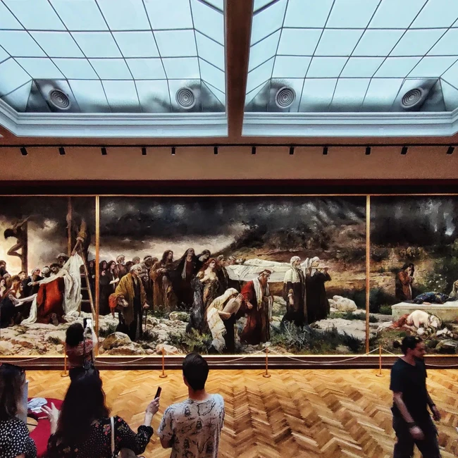 Pictura este un triptic ce reprezintă scena religioasă "Înmormântarea lui Christos" şi a fost realizată de Feszty Árpád, între anii 1898 - 1900, potrivit Agerpres.