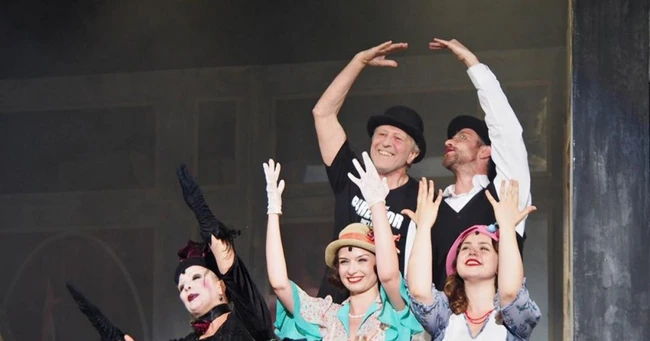 Spectacolul începe chiar de la intrarea în holul sălii "Liviu Ciulei" de la Teatrul Bulandra. O atmosferă de bâlci, în scenografia lui Octavian Neculai, cântece italieneşti şi franţuzeşti interpretate live (muzica lui Raul Kusak, pe care îl putem vedea ulterior şi la pianină). Canţonetele vesele te învăluie, publicul cântă, dansează şi face poze alături de actori, printre căluţi, baloane colorate, lumini stroboscopice. Femei frumoase, în rochii de cabaret (costume Lia Manţoc).