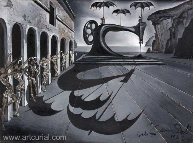Pictorul catalan (1904-1989) a recreat un peisaj "tipic dalinian", o maşină de cusut uriaşă ca protagonistă deasupra căreia stau suspendate umbrele negre deschise care proiectează o umbră lungă.