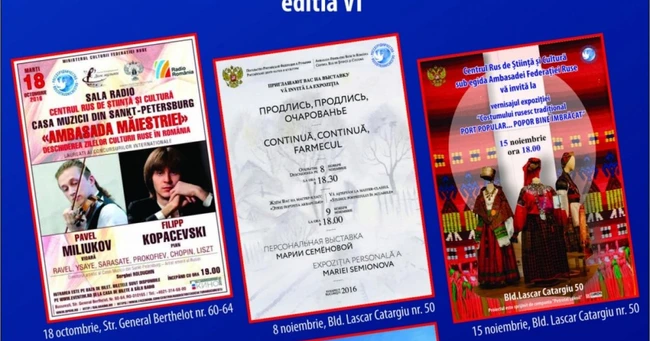 0Centrul Rus de Ştiinţă şi Cultură din Bucureşti, sub egida Ambasadei Federaţiei Ruse, organizează a şasea ediţie a Zilelor Culturii Ruse în România. Se vor desfăşura cinci evenimente importante, în cinci oraşe ale ţării: Bucureşti, Craiova, Ploieşti, Zalău şi Satu Mare. Celebrarea culturii ruse a devenit deja o tradiţie de toamnă în România.