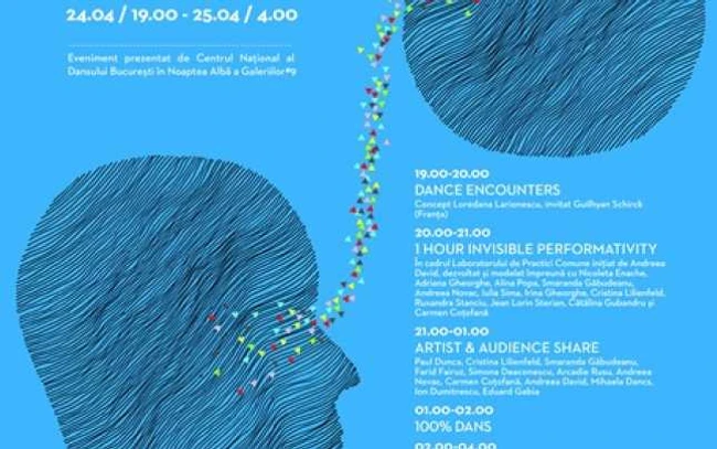 0Sub titlul "Dance Open Source. Artist& audience share", Centrul Naţional al Dansului Bucureşti aniversează Ziua Internaţională a Dansului în Noptea Albă a Galeriilor#9 şi propune publicului un maraton performativ, sub forma unei nocturne dedicate dansului.