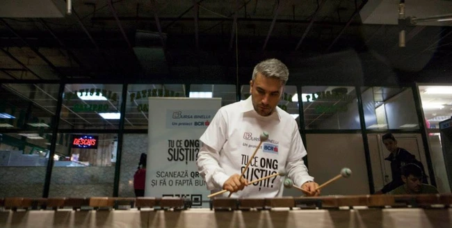 0Mobilizare de forţe, în staţia de metrou Unirii 1, unde o echipă de oameni montează un instrument ce seamănă cu un xilofon, doar că mai mare ca dimensiuni. Chiar dacă este luni seara, ora 18:00, bucureştenii se opresc pentru a vedea ce urmează şi cum sună această raritate.