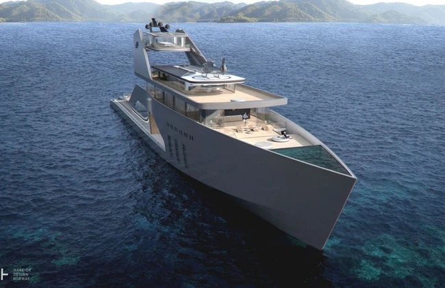 Studioul norvegian Hareide Design din Norvegia a prezentat conceptul unui iaht de lux dotat cu grădină şi două piscine: una clasică şi cealaltă care se formează atunci când o platformă este scufundată automat în apa mării sau oceanului, pentru ca spaţiul desemnat în acest scop să fie inundat.