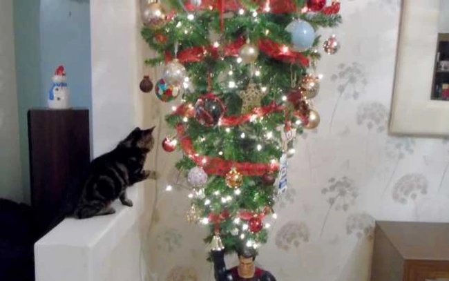 0O familie care locuieşte în Cardiff, Ţara Galilor, a decis să monteze bradul de Crăciun invers, adică cu susul în jos. Ideea îi aparţine Natashei Smith, de 25 de ani, care trăieşte alături de partenerul ei şi de cei trei copii ai lor, dar şi de pisicuţa Storm, răsfăţata celor mici.