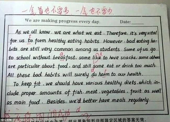 0Elevii de la o scoală gimnazială din China au devenit celebri pe Internet după ce fotografii cu lucrările scrise de ei au fost publicate online. Testele date de elevi sunt scrise în limba engleză şi par să fi fost redactate la calculator, deşi în realitate ele sunt scrise de mână.