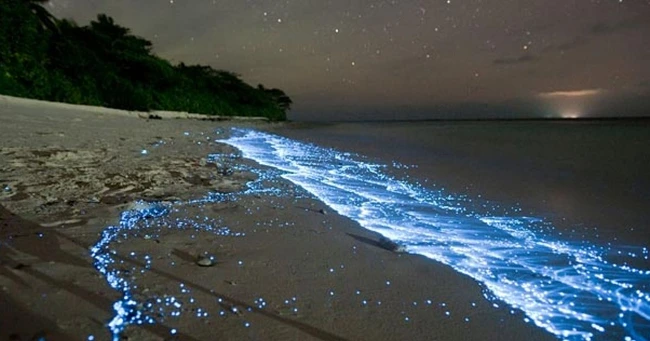 Un fenomen fascinant, numit bioluminiscenţă, a fost fotografiat la malul atolului Raa din Insulele Maldive.