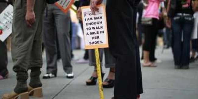 Participanții la eveniment purtau pancarte care spuneau: „Sunt îndeajuns de bărbat să merg o milă în pantofii ei".