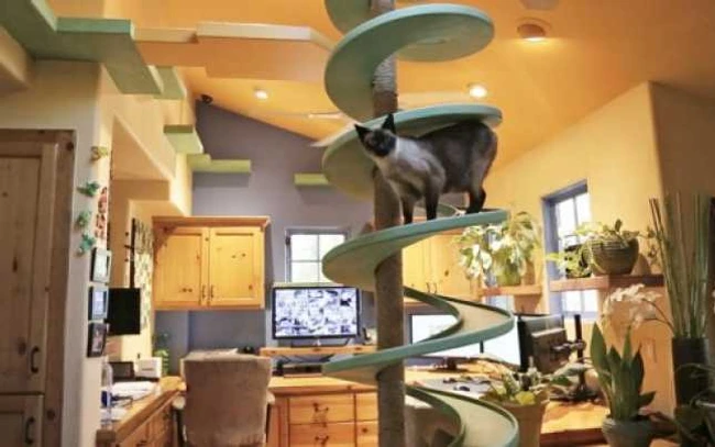 0Un bărbat din California a cheltuit peste 44.000 de euro pentru a-şi transforma locuinţa într-un Rai pentru cele 15 pisici pe care le-a salvat de pe străzi. Casa este plină de scări, tuneluri, rampe şi stâlpi pentru pisici.