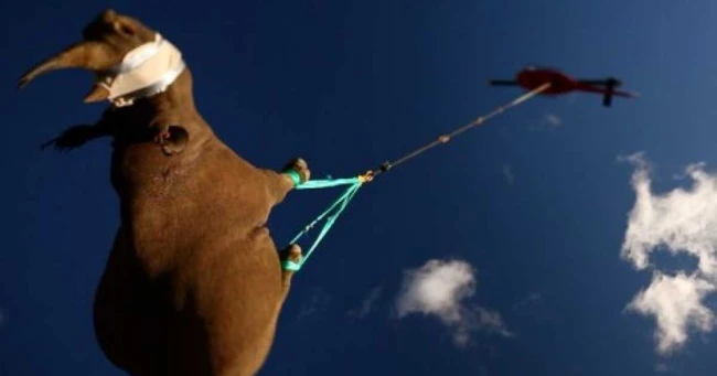 Un rinocer a fost transportat cu un elicopterul, atârnând de acesta, pentru a putea fi scos din zona dificilă în care se afla. Drumul a durat aroximativ 10 minute.