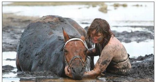 Gestul emoţionant al unei femei: a stat lângă calul său scufundat în noroi, riscându-şi viaţa