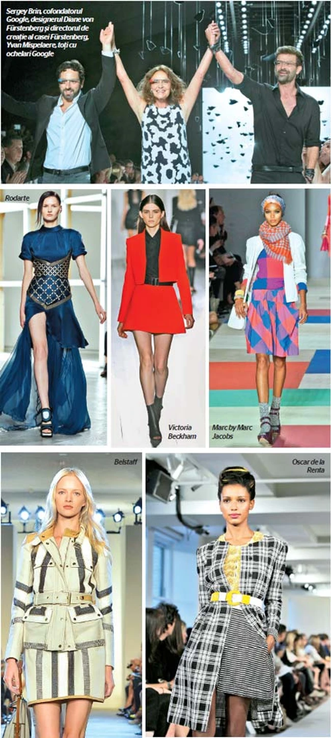 O notă contemporană a dat şi prezentarea designerului de 65 de ani Diane von Fürstenberg, dar nu atât prin colecţia de haine în sine, cât prin colaborarea inedită cu Google. Google Glass, aşa se numesc deja celebrii ochelari ai „gigantului" american, cu rame roz şi albastre, pe care i-au purtat pe podiumul de la New York atât modelele, cât şi Fürstenberg însăşi şi Serghei Brin, cofondatorul Google.