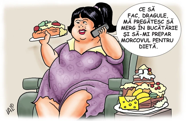 Îngrozită că omul vieţii ei îşi va găsi o amantă care nu gâfâie când se apleacă să se încalţe, Mihaela s-a pus pe regim serios, de data asta pe bune. Chelnerii de la bufetul firmei au sunat iar la psiholog, i-au spus că doamna aceea care mânca până ieri cât un Rotweiller acum vrea doar salată de crudităţi şi apă plată, iar asta sună a greva foamei.