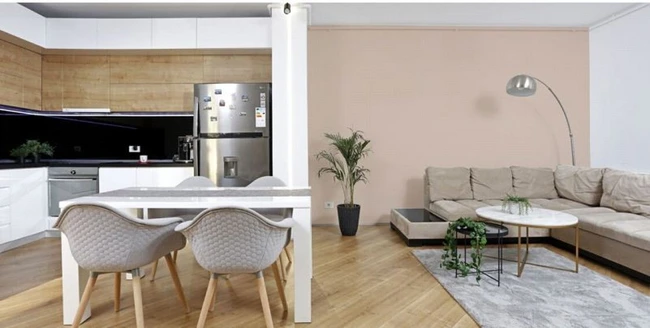 Un apartament din Pipera, cartier din nordul Capitalei, are trei camere şi o suprafaţă de 78 de metri pătraţi. Proprietarii l-au cumpărat la începutul anului 2020 pentru că îşi doreau să locuiască într-un complex nou, liniştit, cu pază şi locuri de joacă pentru fetiţa lor. Au început să îl amenajeze în luna martie, împreună cu designerul de interior Cristian Pătraşcu. Proprietarii au vrut să păstreze canapeaua bej, masa de dining şi patul din locuinţa anterioară. Iar din punct de vedere cromatic, şi-au dorit o paletă de culori neutre cu inserţii de auriu.