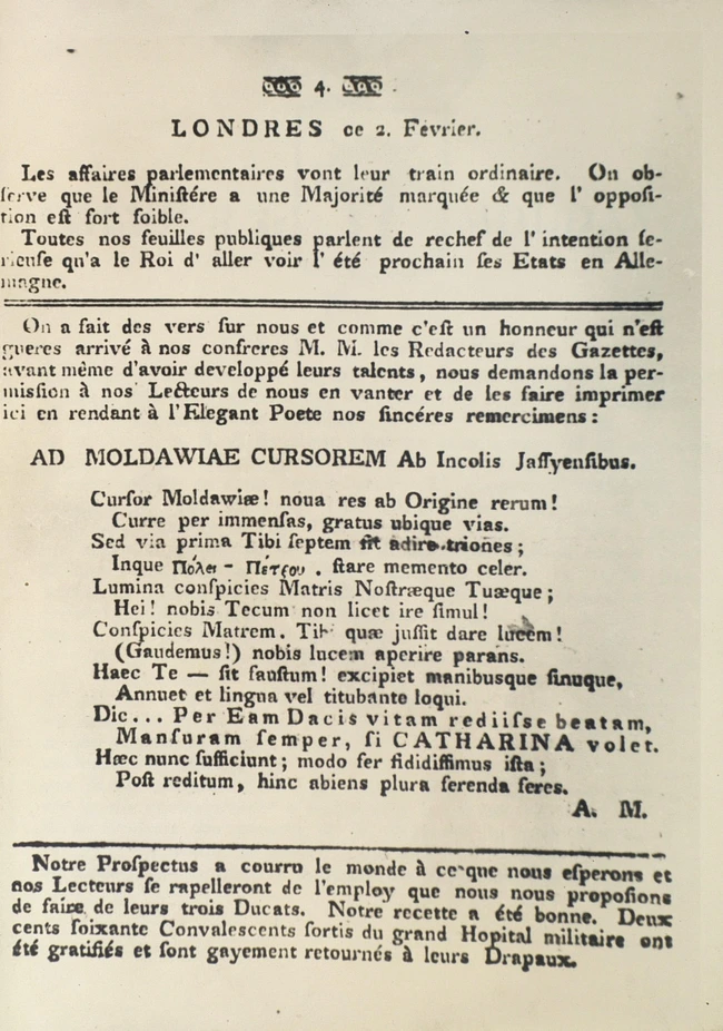 În altă ediție apare și o poezie cu vădit caracter propagandistic, făcând aluzie la „Planul Dacic”, dar și la o presupusă dorință a locuitorilor Iașiului de a se spune împărătesei Ecaterina.
