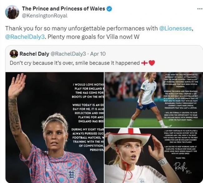 „Mulțumesc pentru atâtea performanțe de neuitat cu @Lionesses, @RachelDaly3”, a scris prințul William pe contul oficial Kensington Royal pe care îl împarte cu soția sa. El a adăugat: „Mult mai multe goluri pentru Villa acum!”.