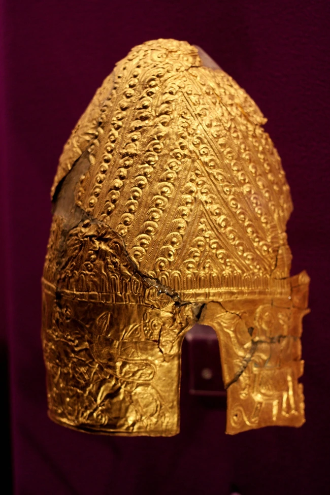 Toate aceste elemente ritualice, acei ochi magici, materialul din care erau executate indică faptul că acele coifuri nu aveau utilitate marțială. Pe câmpul de luptă nu aveau nicio valoare protectivă. O spadă de fier sau o secure din același metal ar fi despicat ușor capul unui luptător echipat cu un coif de aur. În schimb, aceste coifuri erau mai degrabă simboluri ale funcției, ale statutului. Erau asemeni unei coroane regale.