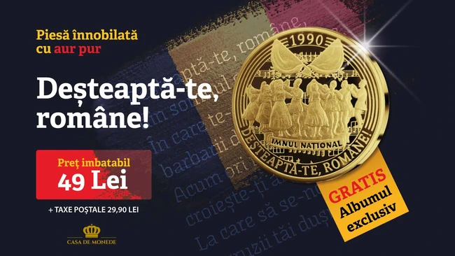 Deșteaptă-te, române! Piesă comemorativă înnobilată cu aur pur la un preț imbatabil