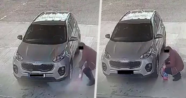 Înregistrările camerelor de supraveghere ale unei benzinării au surprins momentul în care un SUV gri, înmatriculat în Hradec Králové, nordul Cehiei, se apropie de o pompă, șoferul oprește și încearcă să umfle anvelopa stânga față cu stingătorul de incendiu, potrivit Blesk.