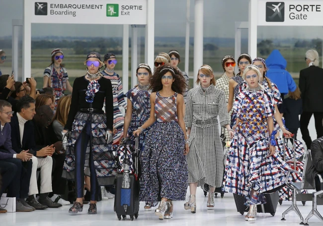 Karl Lagerfeld, directorul creativ al legendarei case de modă Chanel, a dat naştere unei colecţii cu adevărat strălucitoare, la Paris. Modelele au defilat în costume de tweed, cu fuste creion şi jachete cu umeri laţi, pe podiumul amenajat sub forma unui aeroport. Suprapunerile de haine apar în linia vestimentară semnată de Lagerfeld, prin intermediul fustelor purtate peste pantaloni şi a puloverelor legate în jurul taliei sau peste umeri. „Bătute‟ cu pietre strălucitoare, croite din piele subţire, din mătase sau cu broderii florale, creaţiile Chanel îşi păstrează eleganţa subtilă.