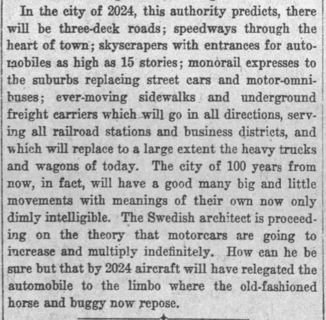 Conform unui articol din 1924, "automobilele vor crește și se vor înmulți la nesfârșit".