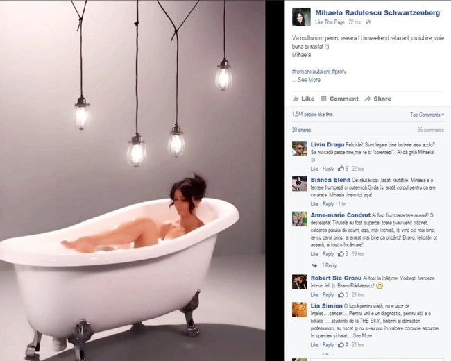 Cel mai recent exemplu este însă unul autohton, după ce vedeta de televiziune Mihaela Rădulescu a postat pe Facebook, vineri seară, o imagine cu hastagul #romaniiautalent #protv, în care apare goală, în timp ce se îmbăiază într-o cadă plină cu spumă. Fotografia este însoţită de mesajul „Vă mulţumim pentru aseară ! Un weekend relaxant, cu iubire, voie bună şi răsfăţ !:)”. Imaginea a strâns deja peste 1.500 de like-uri, dar şi o mulţime de comentarii, cele mai multe apreciative la adresa siluetei de invidiat pe care vedeta nu ezită să o pună în valoare ori de câte ori are ocazia.