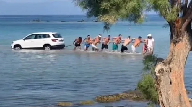 Video Momentul când un SUV este scos din mare de turiștii aflați pe o plajă din Grecia, viral pe internet VIDEO