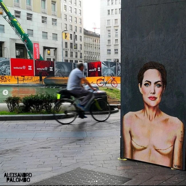 O pictură murală cu Angelina Jolie având cicatrici în urma mastectomiei a apărut într-o piață din Milano