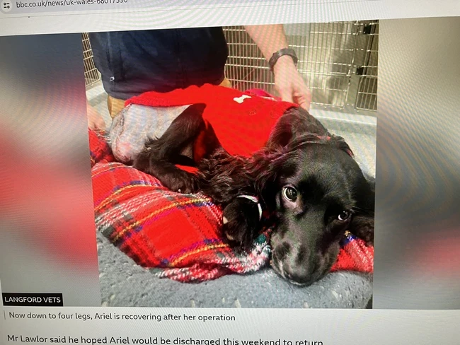 Directorul spitalului Langford Vets', Vicki Black, a adăugat: "Ariel a fost un cățeluș complicat, a cărui îngrijire a necesitat o colaborare strânsă între mai multe echipe de specialiști, inclusiv ortopedie, chirurgie a țesuturilor moi, anestezie și radiologie. Ca parte a Universității din Bristol, suntem un centru angajat în învățarea pe tot parcursul carierei și suntem mândri să inovăm și să tratăm animale de companie precum Ariel. Suntem încântați că un animal atât de drăguț s-a recuperat bine după operație."