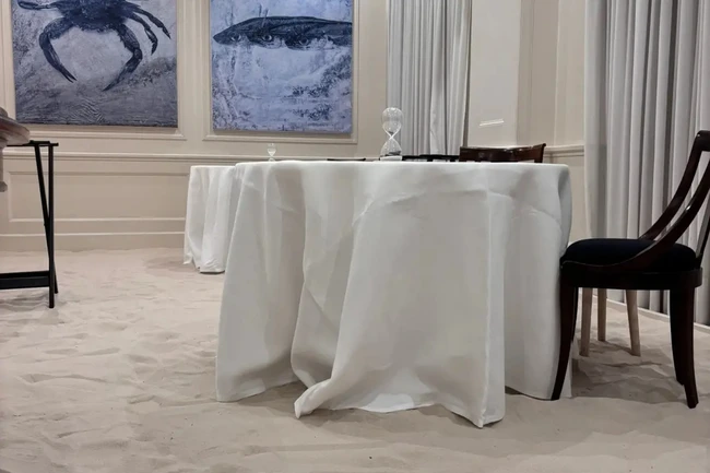 Oaspeții au fost invitați să renunțe la pantofi și să intre desculți sau în papuci, pentru a trăi o experiență completă, în care gastronomia s-a îmbinat cu atmosfera de vacanță, relatează presa italiană, Corriere della Serra.