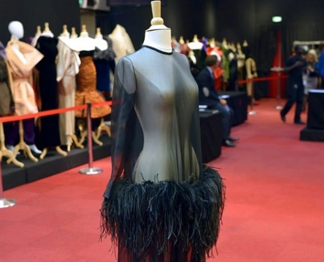Printre cele peste de 300 de loturi propuse la vânzare, s-a aflat şi o rochie lungă creată de Yves Saint Laurent, din muselină neagră transparentă la nivelul bustului, ornată cu pene de struţ în partea inferioară. Estimată între 13.000 de euro şi 15.000 de euro, rochia, creată în 1968, după măsurile corporale ale manechinului Danielle Luquet de Saint Germain, a fost vândută cu 118.750 de euro (taxe incluse).