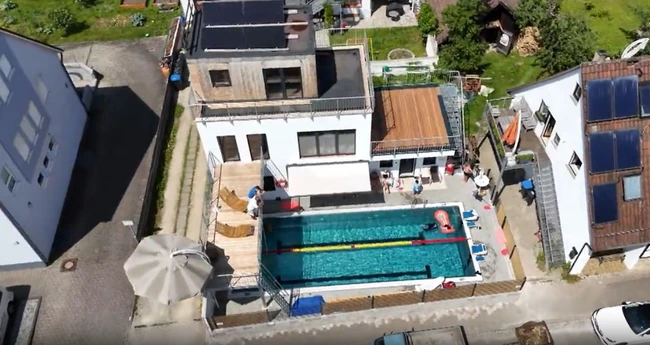 Rezultatul: un bazin de 12,5 metri lungime, 4,5 metri lățime și 2 metri adâncime, cu blocuri de start, leagăne suspendate deasupra apei, vestiare, dușuri și o terasă pentru relaxare.
